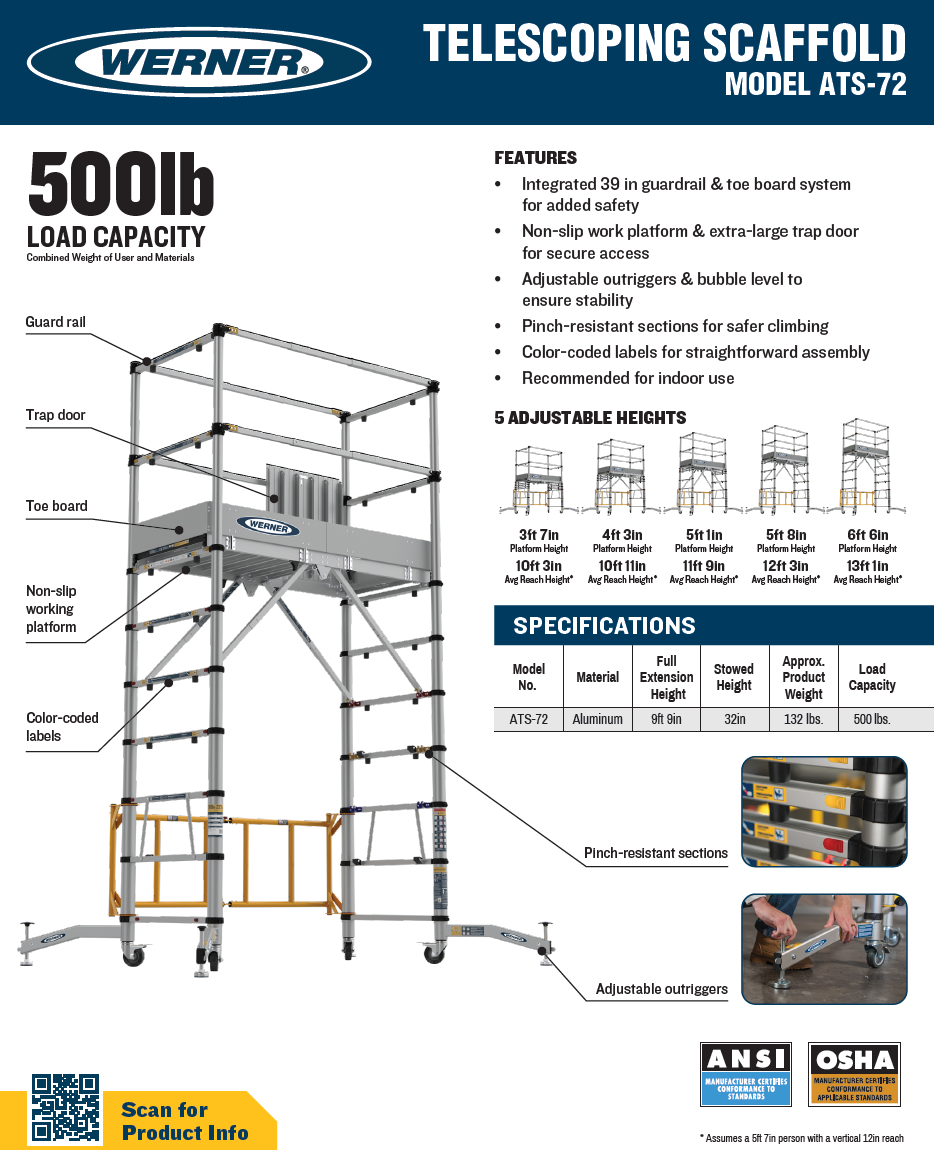The ATS-72 6-foot Aluminum Telescoping Scaffold has a 1-person, 500-pound load capacity (distributed evenly). It easily and securely telescopes to 5 platform heights. Efficiently packed and ready to roll, it goes from compact to climb-ready in minutes. Uniquely made to adjust to multiple heights and maneuver where other scaffolds cannot. It includes a 39-inch guardrail and toe board system, a non-slip work platform with an extra-large trapdoor, and built-in adjustable outriggers.