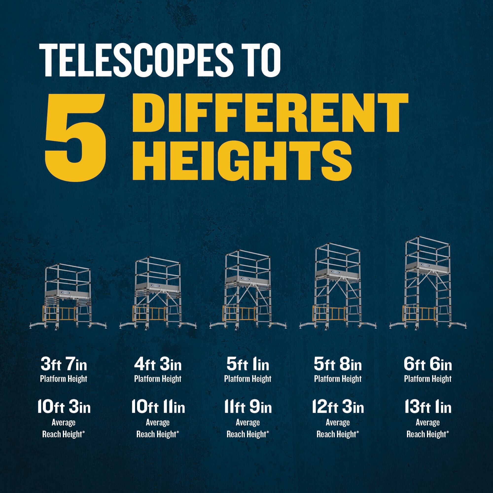 - Easily and securely telescopes to multiple platform heights: 6’6”, 5’8”, 5’1”,4’3”, 3’7”